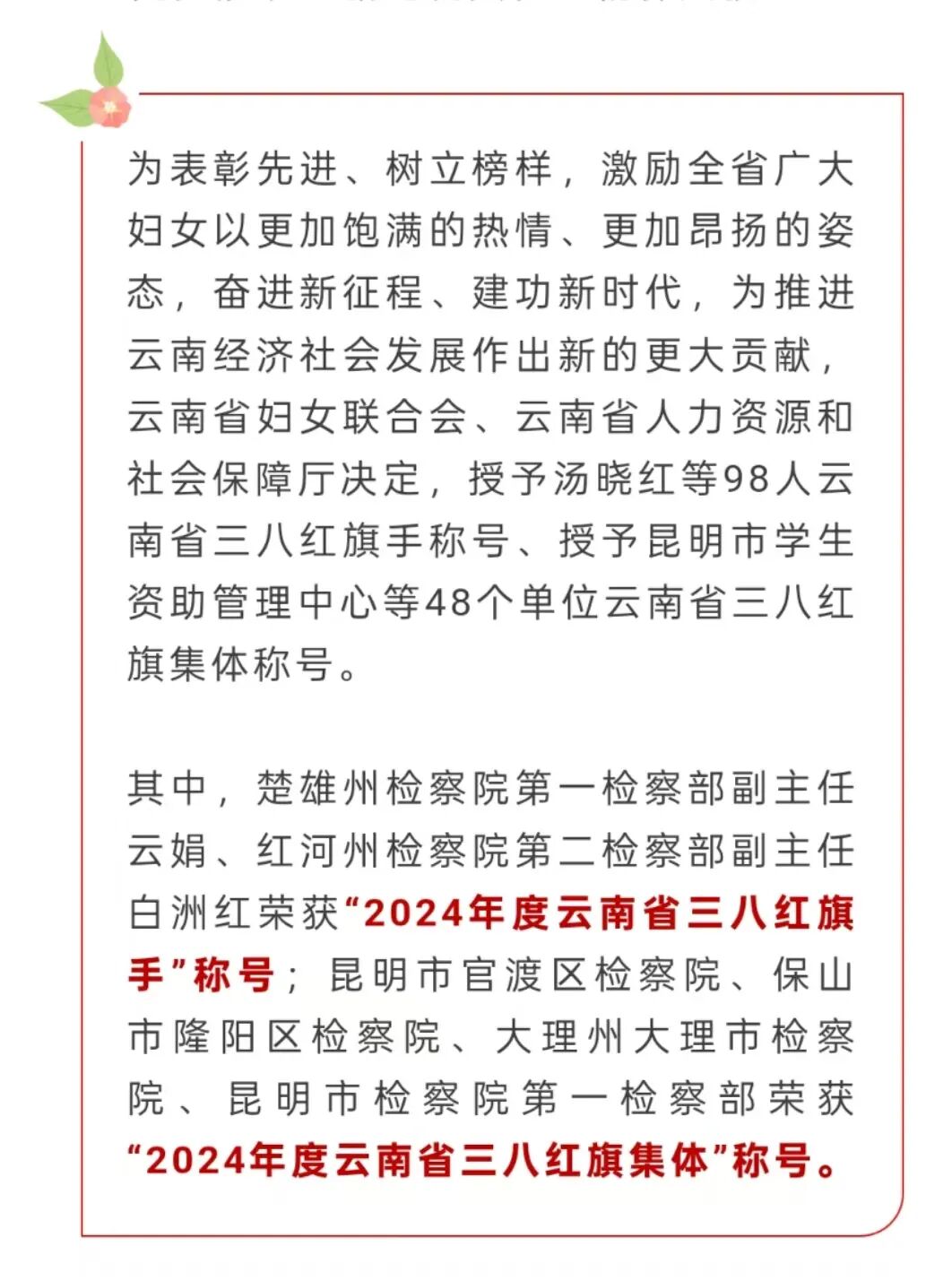 近日,云南省妇女联合会、云南省人力资源和社会保障厅联合决定表彰的2024年度云南省三八红旗手、云南省三八红旗集体名单揭晓,隆阳区人民检察院被授予“2024年度云南省三八红旗集体”称号。